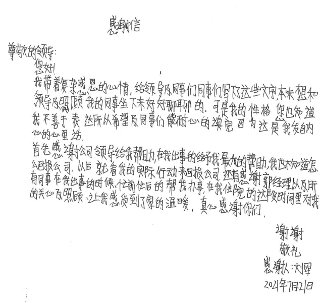 经过半个月治疗休养,刘军手部已无大碍。出院后的他写了一封感谢信并为公司送了一面锦旗,他说道,是诚德永信这个大家庭让他感受到了关怀和温暖,他表示要把这种关怀变成工作上的动力,争取早日返回工作岗位,努力工作,回报大家的关心和关爱。