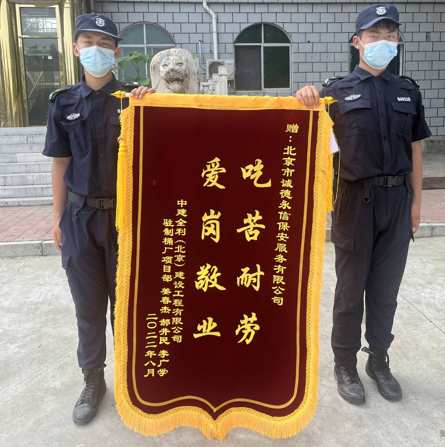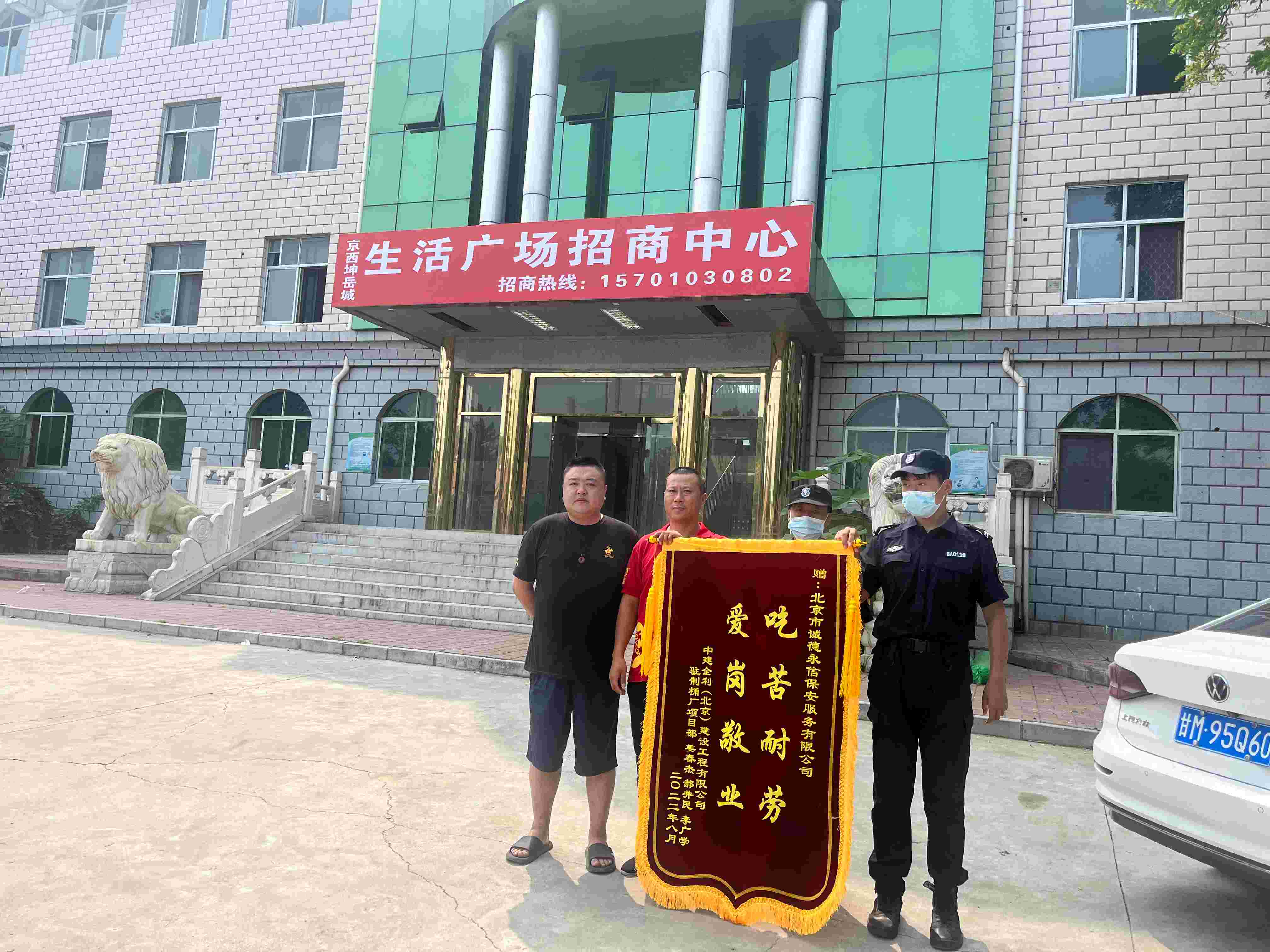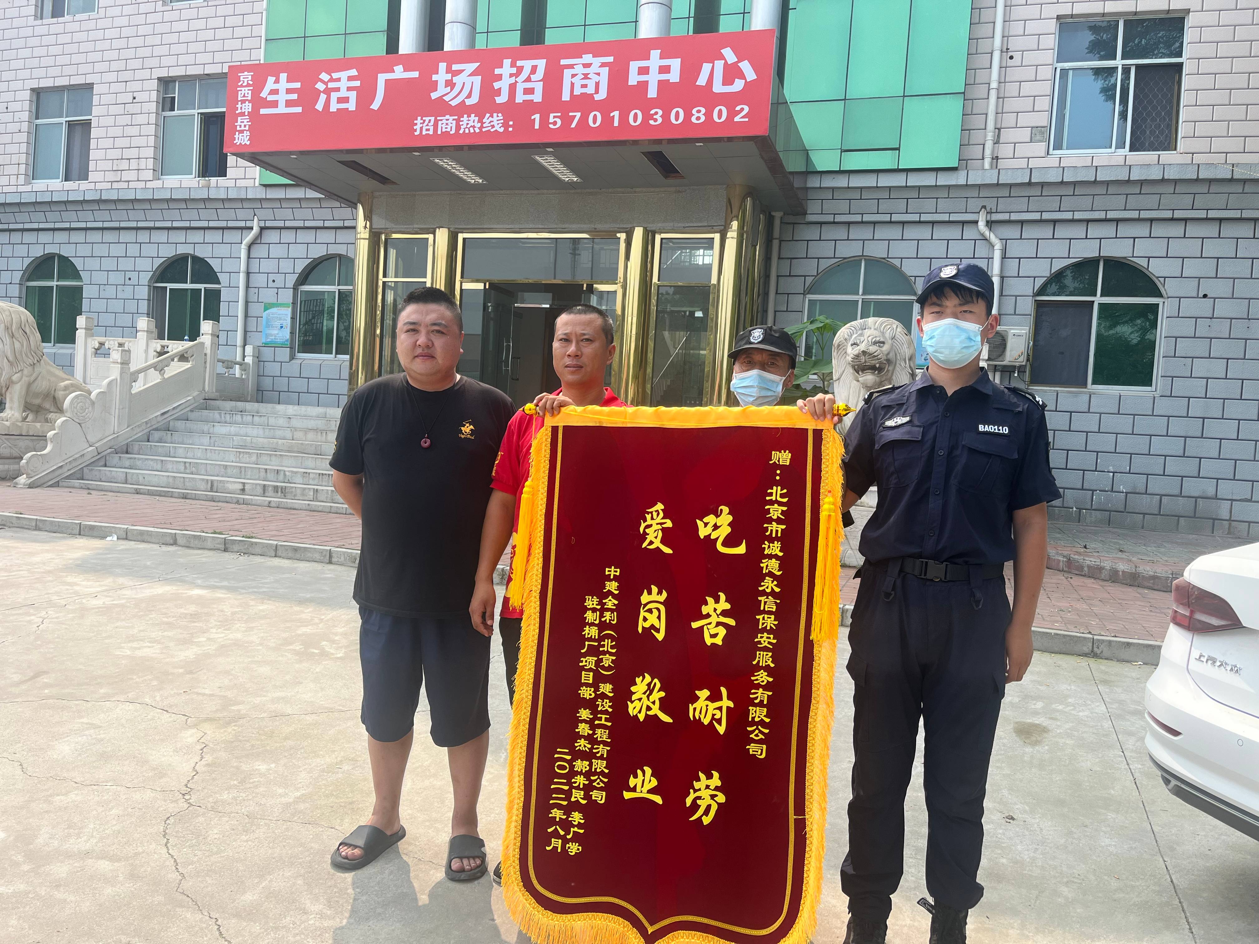 202281日,中建全利招商办公处驻制桶厂项目部由姜春杰等人为代表,将一面绣有“吃苦耐劳,爱岗敬业”的锦旗送到北京市诚德永信保安服务有限公司项目负责人的手中,对我司保安队的优异工作表现表示诚挚的感谢。